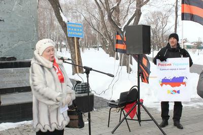 «Если мы сегодня пойдёт на уступку фашистам, что нас будет ждать? Нас и так не уважают в мире, а после этого вообще уважение к нам пропадёт. Поэтому, Путин и Медведев не должны прогнуться под Соединёнными Штатами Америки, которые хотят ослабить нас окончательно, разрушив Украину. А разрушив Украину, они двинутся к нам в Россию. Сегодня мы пришли сюда под разными флагами. Поэтому мы должны быть едины в том, что народ Украины, русскоязычный народ, должен быть нашим другом. Мы должны жить, как многие века, вместе и дружно. Россия началась с Киевской Руси – это истоки нашей Родины. Поэтому не должны эти истоки быть преданы забвению бандеровцами, фашистами, которые сегодня к этому идут», - отметила Тамара Казанцева.