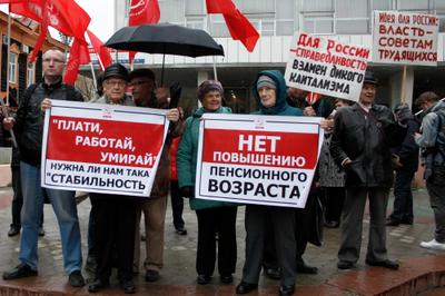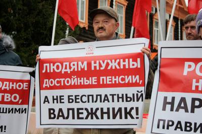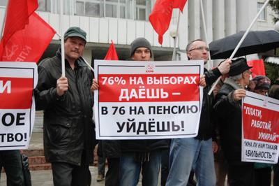 Активисты КПРФ вышли к зданию «Облсовпрофа» с плакатами: «НЕТ повышению пенсионного возраста!», «76% на выборах даёшь – в 76 на пенсию уйдёшь!», «Людям нужны достойные пенсии, а не бесплатный валежник!».
