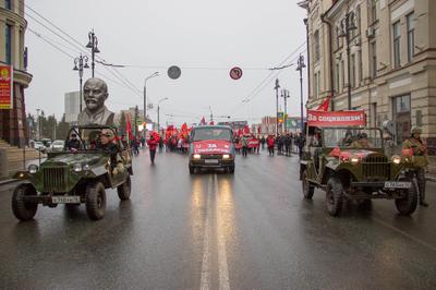 К шествию в честь годовщины Октября присоединились участники организации «Дети войны», члены лево-патриотических партий, комсомольцы, а также томские реконструкторы на ретроавтомобилях. Во главе колонны коммунисты растянули главный лозунг мероприятия: «Россия для народа! Долой власть олигархов!». Участники демонстрации пронесли по главной улице Томска портреты Маркса, Энгельса, Ленина, Сталина.