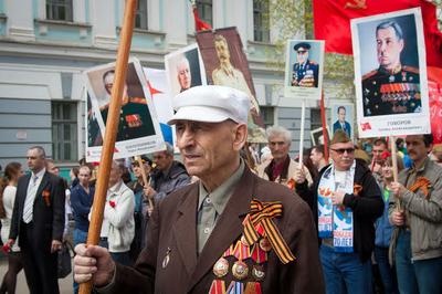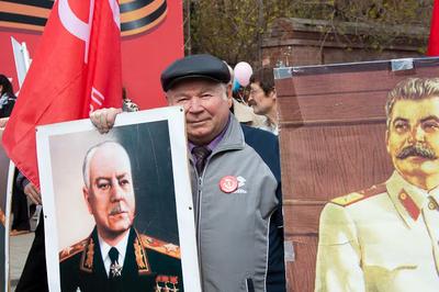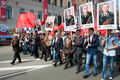 По традиции, члены и сторонники Партии, «дети войны» организовали свою «красную» колонну. Ее участники пронесли по главной улице города портреты советских полководцев и советские знамена.