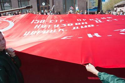 В отличие от прошлых лет, в 70-ю годовщину Победы красные флаги виднелись не только над колонной коммунистов. Во главе шествия волонтеры пронесли 10-метровую копию Знамени Победы, в а небе над праздничным шествием кружил аэроплан, также украшенный красным стягом. В этом есть и заслуга коммунистов: в 2014 году благодаря фракции КПРФ в Законодательной Думе Томской области был принят региональный закон о копии Знамени Победы, и в год 70-летия Победы реплики штурмового флага 150-й ордена Кутузова II степени Идрицкой стрелковой дивизии заняли свое законное и почетное место в праздничной колонне.