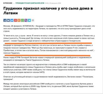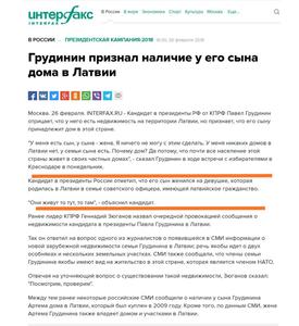 Все началось с того, что на встрече с избирателями П.Н. Грудинин спокойно и внятно объяснил, почему у его сына есть недвижимость в Латвии: «У меня есть сын, а у сына есть жена. Вот так получилось, что девочка, которая родилась в семье советского офицера, а он последнее место жительства было, т.е. службы - в Латвии. Он остался там, а потом она сюда приехала, но у нее латвийское гражданство. Она приехала, и они полюбили друг друга. Я ничего не могу сделать, это было 11 лет назад. И они поженились, и у меня 3 внуков. Но они живут то тут, то там. Значит, здесь и там. А у них там нету квартиры. У них там в Латвии почти все дома. Ну и что теперь делать мне с этим?» (цитата из сюжета на канале РЕН-ТВ (Рен ТВ # Новости, Москва, 26 февраля 2018 23:16), тоже, кстати, на наш взгляд, тенденциозного и по сути клеветнического).