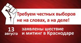 "Требуем честных выборов не на словах, а на деле!". На 13 августа заявлены шествие и митинг в Краснодаре против административного произвола, попыток снятия с выборов секретаря ЦК КПРФ Сергея Обухова, физического насилия в отношении представителей КПРФ