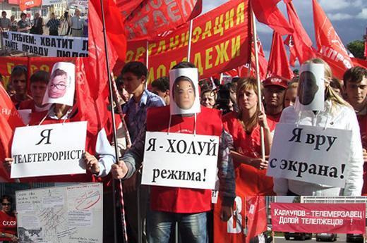 «Требуем равного доступа парламентским партиям к СМИ!», «Караулов – телемерзавец. Долой телелжецов!». Всероссийская акция КПРФ против информационной блокады оппозиции