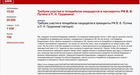На сайте "" начался сбор подписей под петицией «Требуем участия в теледебатах кандидатов в президенты В.В.Путина и П.Н.Грудинина». Ниже публикуем обращение авторов петиции.