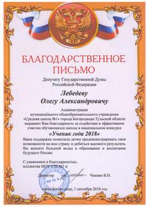 Администрации школы № 1 г. Богородицка выразила благодарность депутату Государственной Думы Олегу Лебедеву за большой вклад в образование и воспитание будущего России.