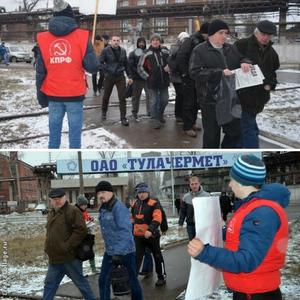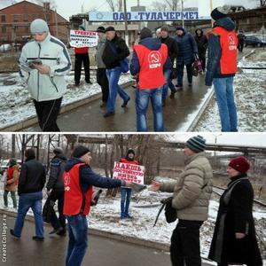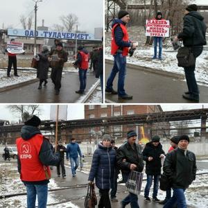 Тульские коммунисты в рамках Всероссийской акции протеста против неэффективной государственной социально-экономической политики, проводимой Правительством РФ, в течение последней недели провели серию массовых пикетов у проходных крупных заводов.