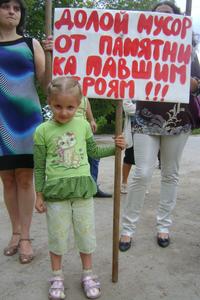 Организаторы пикета держали в руках самодельные плакаты: «Глава, покидая свой пост правления, оставляет для памятного места лишь мусорное наследство», «Администрация, имейте уважительное отношение к мемориалу», «Почему никто не спросил у населения, где ставить контейнеры?», «Долой мусор от памятника павшим героям!», «Оставьте площадь у мемориала в чистоте!» Склеив из бумаги стилизованный контейнер в натуральную величину, они водрузили над ним символический мусор, а выше растянули флаг, чтобы показать, что контейнерная площадка у братской могилы оскорбляет память тех, кто погиб в войнах, тех, кто воевал и победил под этим флагом, и их ныне живущих потомков.
