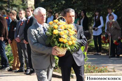 У Вечного огня в Урванском состоялся митинг. Председатель Совета ветеранов Новомосковска, почётный гражданин города, депутат городского Собрания от КПРФ Кузьма Спирочкин вместе с главой местной администрации Вадимом Жерздевым возложил к монументу корзину цветов.