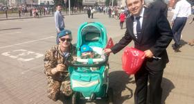 На фото: Депутат-коммунист Максим Дронов раздаёт уменьшенные копии Знамени Победы участникам шествия «Бессмертного полка» в городе-герое Туле