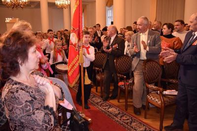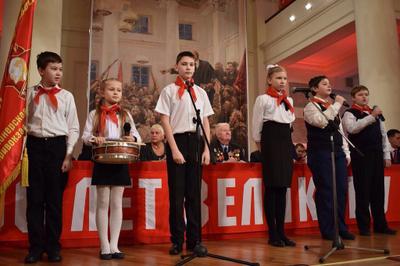 Приветствовать участников торжественного собрания пришли юные пионеры. С красным знаменем, под бой барабана и громкие аплодисменты собравшихся прошли они через весь зал и поднялись на сцену. В своем стихотворном обращении юные ленинцы говорили о верности идеям Великого Октября – идеям свободы, мира и социальной справедливости. В заключении выступления пионеры спели свой гимн – «Взвейтесь кострами, синие ночи», который дружно подхватил весь зал.