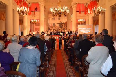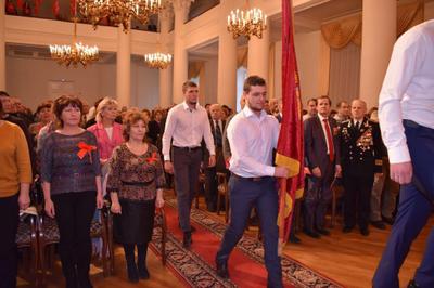 Торжественное мероприятие в честь 100-летия Великой Октябрьской социалистической революции завершилось на высокой эмоциональной ноте, когда весь зал дружно встал при исполнении гимна Советского Союза.