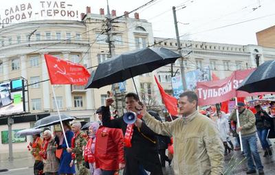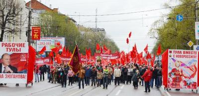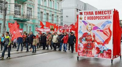 Вначале колонны, как в добрые Советские времена, коммунисты везут трехметровые транспаранты: «РАБОЧИЕ ТУЛЫ ЗА ЗЮГАНОВА!» и «ТУЛА ВМЕСТЕ С НОВОРОССИЕЙ».