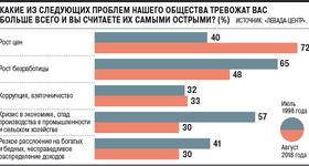 В ходе своего ежегодного опроса (проводился в конце августа) о проблемах, которые волнуют россиян, «Левада-центр» выяснил, что по сравнению с аналогичным периодом 2017 года респонденты стали отмечать практически все проблемы, перечисленные в опросном листе. Чаще всего граждане (72% опрошенных) отмечали рост цен. 52% чувствуют «обнищание населения». Обеспокоенность ростом безработицы выше, чем в предыдущие годы: практически каждого второго россиянина (48%) волнует эта проблема. По 30% респондентов сказали о кризисе в экономике и несправедливом распределении доходов. 21% россиян проблемой считают «кризис морали, культуры и нравственности».