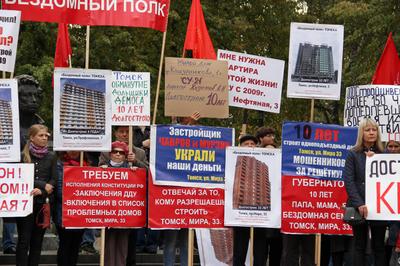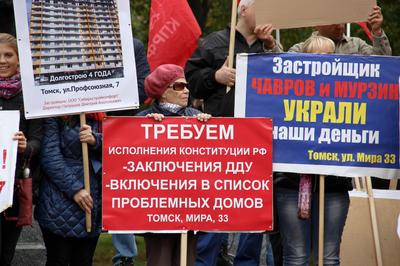 16 сентября в Пушкинском сквере прошёл митинг обманутых дольщиков, собравший более сотни представителей 11 долгостроев Томска. Организаторами акции выступили первый секретарь Томского обкома КПРФ Алексей Фёдоров и инициативная группа обманутых дольщиков во главе с активисткой Ириной Крайсман.