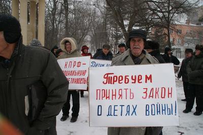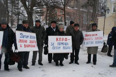 Несмотря на необычно холодную для Черкесска погоду, мороз и ветер, в пикете приняли участие более 40 человек. В руках у протестующих плакаты: «Дети войны – поколение героического труда!», «Детям войны – защиту государства!», «КПРФ за социальную справедливость!», «Детям войны – особую заботу и внимание!», «Требуем принять закон о детях войны!» и другие.