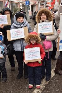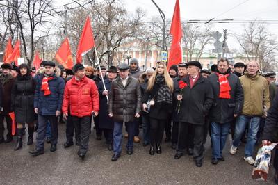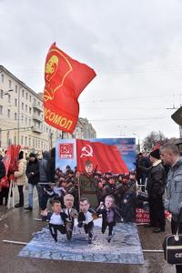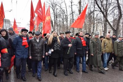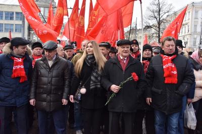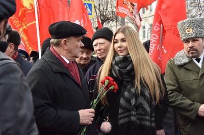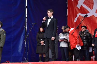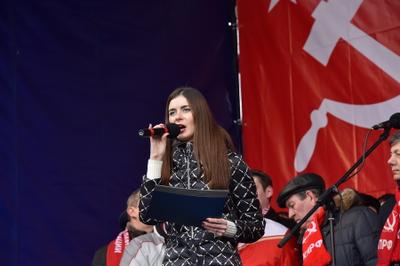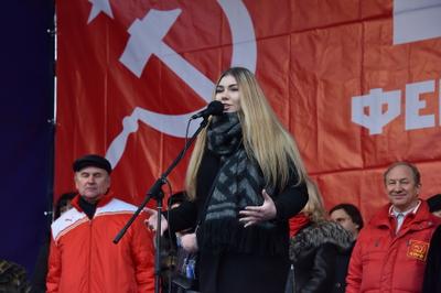 Затем выступила многократная чемпионка мира по пауэрлифтингу среди женщин, комсомолка Марьяна Наумова. Она рассказала о своей поездке в Донецк, где, по ее словам, тысячи женщин встали на защиту своей республики от бандеровских полчищ. Марьяна поздравила с праздником участников митинга, а также ополченцев в Донбассе и российских бойцов в Сирии.
