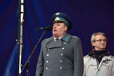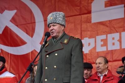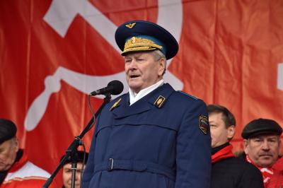 Затем слово было предоставлено генерал-лейтенанту, председателю ЦИК международного объединения Союза советских офицеров Г.М. Бенову. Вначале Геннадий Матвеевич от международного Союза советских офицеров поздравил участников митинга с праздником. Он подчеркнул, что члены его организации, несмотря на внешнее противодействие, продолжают славные традиции советской Армии и Флота.