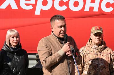 После прошел автопробег по центру Ульяновска. Во главе автоколонны — 20-тонная фура, которая направилась в Херсонскую и Запорожскую области.