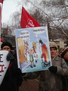 С большим интересом прохожие рассматривали и одобрительно комментировали сатирические плакаты, с которыми стояли пикетчики, высказывали свою поддержку лозунгам «Путина – в отставку!», «Людоедские тарифы ЖКХ – результат голосования за ЕР», «Жилищно-коммунальный беспредел – это подарок от ЕР!», «Рост тарифов ЖКХ – голод и нищета миллионов!», «Вор на воре и вором погоняет», «Прогрессивный налог на роскошь – путь к снижению цен и тарифов», «Долой кремлевские и местные властные кланы!».