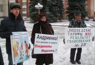 Затем коммунисты провели пикет у так называемой «Общественной приемной председателя партии Единая Россия Д.А. Медведева». С 22 ноября проводится ежедневное одиночное пикетирование этого заведения с целью доведения до сознания правящих кругов возмущения граждан бешеным ростом тарифов на услуги ЖКХ. Сегодня проводился групповой пикет, на который заблаговременно было подано уведомление. Внимание ульяновцев привлекали лозунги «Людоедские тарифы ЖКХ – результат голосования за «ЕР», «Коммунальный беспредел - это подарок от «ЕР» и сатирические плакаты.
