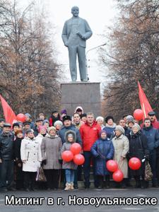 Праздничный митинг начался с воспроизведения записи выступления нашего земляка, вождя мирового пролетариата, основателя советского государства В.И. Ленина: «Что такое Советская власть?». Затем, слово взял первый секретарь Ульяновского обкома КПРФ, депутат Государственной Думы РФ Алексей Куринный. Также выступили: член бюро областной партийной организации, секретарь Засвияжского райкома КПРФ Виталий Кузин, руководитель коалиции левопартиотических общественных организаций Владимир Аладин, медицинский работник, член КПРФ Виктор Гусь, руководитель общественной организации «За экологическую окружающую среду!» Наири Чатинян. Выступающие вспоминали славное социалистическое время, достижения великого государства, а также с горечью рассказывали о «заслугах» современной власти по развалу достижений СССР. Между выступлениями, праздничное настроение поддерживал певец