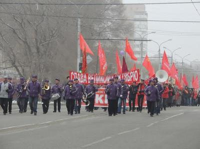 Участники праздничной акции собрались у гостиницы «Дружба», развернули транспаранты, лозунги, флаги, надели накидки, шарфы, выстроились в колонну и пошли к памятнику В. И . Ленину на Первомайской площади, где в 13 часов начался митинг .