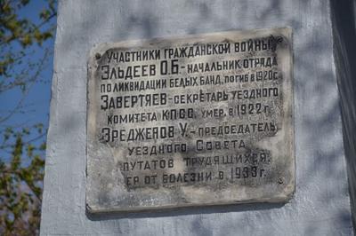 Мемориал, в котором захоронены участники Гражданской войны, на территории средней школы №20 в п. Приволжье, попал в поле зрения коммунистов Трусовского районного отделения КПРФ. В Братской могиле были захоронены О.Б. Эльдеев – начальник отряда по ликвидации белых банд, У.Эредженов - председатель уездного совета депутатов трудящихся и Завертяев – секретарь уездного комитета партии.