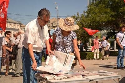 На митинге раздавались агитационные материалы, спецвыпуск газеты «Правда», газета «Астраханская правда».