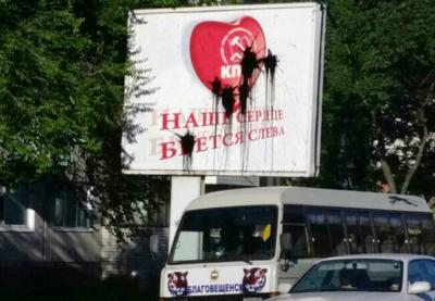 В ночь на 14 июля два баннера КПРФ в Благовещенске были облиты краской. В городской комитет партии о хулиганкой выходке сообщили горожане, заметившие результат политической диверсии. Подлой атаке подвергся рекламный щит по улице Пролетарская между Калинина и Комсомольской, а также теплотрасса на Игнатьевском шоссе. Общий ущерб, нанесенный вандалами, превышает 100 тысяч рублей (изготовление и монтаж наружной рекламы).