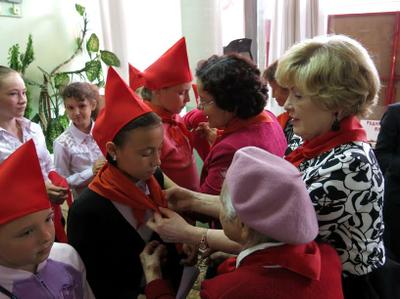 Первый секретарь Алатырского горкома КПРФ, депутат Госсовета ЧР Т.А. Старёва 19 мая торжественно повязала красные галстуки 26 ребятам в городской школе №11.