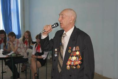 К пионерам обратился ветеран Великой Отечественной войны Геннадий Александрович Додонов. Геннадий Александрович во время войны был юнгой. Он рассказал ребятам, что за годы войны погибли почти 1000 юнг, юных моряков – подростков. Они отдали свои жизни за свободу и независимость Родины, как и многие другие юноши и девушки – пионеры-герои, сыны полков. Надо помнить и чтить память погибших подростков – участников войны, сказал ветеран.