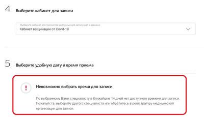 Однако даже если не возникает ошибок, нередко обнаруживается, что записаться на вакцинацию невозможно из-за, как минимум, двухнедельных очередей (больше сайт не показывает).