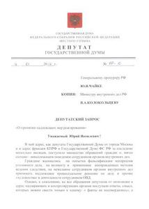 В мой адрес, как депутата Государственной Думы от города Москвы и в адрес фракции КПРФ в Государственной Думе ФС РФ за последние несколько месяцев поступило множество обращений граждан о, мягко сказано, - ненадлежащем поведении сотрудников органов внутренних дел.
