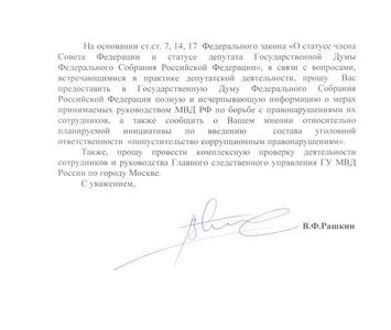 На основании ст.ст. 7, 14, 17 Федерального закона «О статусе члена Совета Федерации и статусе депутата Государственной Думы Федерального Собрания Российской Федерации», в связи с вопросами, встречающимися в практике депутатской деятельности, прошу Вас предоставить в Государственную Думу Федерального Собрания Российской Федерации полную и исчерпывающую информацию о мерах, принимаемых руководством МВД РФ по борьбе с правонарушениями их сотрудников, а также сообщить о Вашем мнении относительно планируемой инициативы по введению состава уголовной ответственности «попустительство коррупционным правонарушениям».