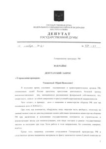 В связи с вышеизложенным, на основании ст. ст. 7, 14 Федерального закона «О статусе члена Совета Федерации и статусе депутата Государственной Думы Федерального Собрания Российской Федерации», в связи с вопросами, встречающимися в практике депутатской деятельности просим Вас провести проверку фактов, изложенных в данном обращении и прилагаемых к нему документов.