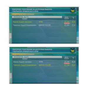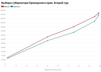 Выборы в Приморье выборами назвать язык не поворачивается. Когда люди в защитных костюмах и масках приходят зачищать территориальную избирательную комиссию . Когда после подсчёта 98,77% голосов у кандидата от КПРФ 245 095 голосов, а после подсчёта 99,03% - 245 090, на 5 голосов меньше. Когда в последний момент всю ночь значительно проигрывавший единоросс вдруг резко набрал несколько тысяч голосов (этот момент хорошо видно на графике). Благодаря переписанным протоколам, естественно.