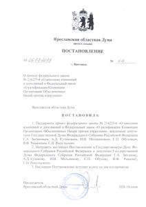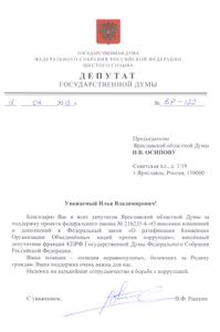 Благодарю Вас и всех депутатов Ярославской областной Думы за поддержку проекта федерального закона N216235-6 «О внесении изменений и дополнений в Федеральный закон «О ратификации Конвенции Организации Объединённых наций против коррупции», внесённый депутатами фракции КПРФ Государственной Думы Федерального Собрания Российской Федерации.