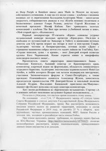 Или по сообщению другого информационного сайта (http://www.tatler.ru/nashi_lyudi/reytingi_25/180017_top10_poyushchih_politikov_i_biznesmenov.php#p=180031;): « Cоветник генерального директора «Ростехнологий» удивляет общественность на мировых аукционах причудой: скупает дорогие гитары. В доме заслуженного энергетика из Самары на Рублево-Успенском шоссе в особых условиях хранится более двухсот пятидесяти инструментов. Стоит Владимиру взять в руки Gibson или акустический Martin, как элегантный доктор Джекилл превращается в лидера блюзовой группы D'Black (красивый вариант трактовки названия – «глубоко черный», как музыка Луизианы и Чикаго). «Недавно Анатолий Борисович Чубайс спросил, не собираюсь ли я обратно в «большой бизнес». Я ему сказал, что иногда думаю об этом, но очень редко. В промежутках между репетициями и выступлениями». Аудитория: фанаты блюзового вуги от Великой Китайской стены до Гибралтара…