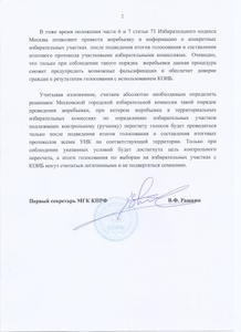 Первый секретарь МГК КПРФ В.В. Рашкин предложил председателю Московской городской избирательной комиссии Валентину Горбунову честную и прозрачную процедуру обязательного ручного пересчета голосов на избирательных участках с КОИБами.