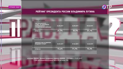 Коснулись в программе и манипуляций с рейтингом президента России Владимира Путина. 25 мая ВЦИОМ опубликовал опрос, в котором рейтинг Путина рекордно упал – до 31,7%. При этом исследования других социологических организаций также показывали падение его рейтинга. Однако после недовольства Кремля ВЦИОМ срочно скорректировал методику подсчёта. В результате по новой методике президенту посчитали рейтинг в 72%. «Десятилетия всех устраивала старая методика, – отметил Рашкин, – пока у Путина было за 50-60%. Но Песков окрикнул: почему 31%? Ну-ка, расскажите мне! И тут же придумали новую методику. Таких методик можно сколько угодно нарисовать. Но главное, что после окрика из Кремля её придумали, сделали опрос – и вот вам, пожалуйста, опять 72%».