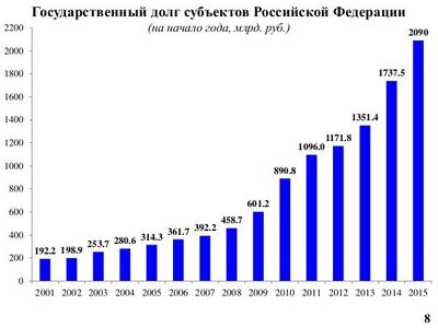 - рост государственного долга субъектов РФ (на 2015 – более 2 триллионов рублей)