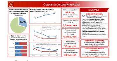 Вопрос финансирования сегодня является критически важным и для социального развития села. У нас 95 тысяч деревень не газифицированы, 32 тысячи деревень не имеют почтовой связи, 43 тысячи не охвачены телефонной связью. И это при том, что всего сельских населенных пунктов у нас осталось около 160 тысяч. Более 20 тысяч деревень ушли в небытие, 42 тысячи сел имеют не более 6 жителей.