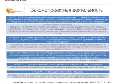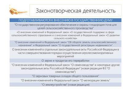 Перспективные законопроекты - «О внесении изменений в статью 37 Федерального закона «Об образовании в Российской Федерации» (в целях совершенствования организации питания обучающихся, получающих начальное общее образование в общеобразовательных организациях)», «О внесении изменений в Федеральный закон «О государственной поддержке в сфере сельскохозяйственного страхования и о внесении изменений в Федеральный закон «О развитии сельского хозяйства», "О внесении изменений в Федеральный закон "Об обороте земель сельскохозяйственного назначения" и Федеральный закон "О государственной регистрации недвижимости", «О внесении изменений в Федеральный закон «О сельскохозяйственной кооперации», «О внесении изменений в Федеральный закон от 25 июля 2011 года №260-ФЗ «О государственной поддержке в сфере сельскохозяйственного страхования и о внесении изменений в Федеральный закон «О развитии сельского хозяйства».