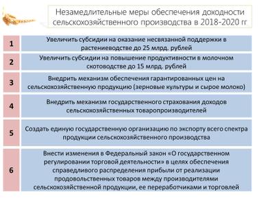 Наряду с этим должна быть создана система страхования доходов сельскохозяйственных товаропроизводителей, а также единый государственный страховщик, гарантирующий эффективность и прозрачность страховых операций.