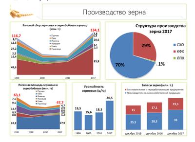 В производстве зерна мы определенно добились прорыва. Валовой сбор зерна наши крестьяне увеличили на 11% по отношению к 2016 году и преодолели отметку 134 млн. тонн. Урожайность в целом по зерновым превысила 30 ц/га! Это позволило России заслуженно занять лидирующие позиции на мировом зерновом рынке.