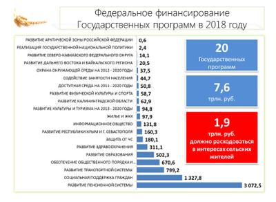 Продолжать можно очень долго, включив в список госпрограмм, упускающих из поля зрения интересы сельских жителей, такие, как «Доступная среда», «Обеспечение доступным и комфортным жильем и коммунальными услугами граждан Российской Федерации», «Содействие занятости населения», «Развитие культуры и туризма», и т.д. Всего 20 Государственных программ, на реализацию которых из федерального бюджета в 2018 году будет выделено 7 640 млрд. рублей, напрямую затрагивают интересы жителей сельских территорий, но фактически не уделяют им какого-либо внимания.