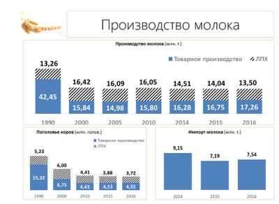 Товарного молока мы производим всего 17-18 млн. тонн. Уровень потребления молока населением упал до 230-240 кг., что на 90 кг. меньше нормы.