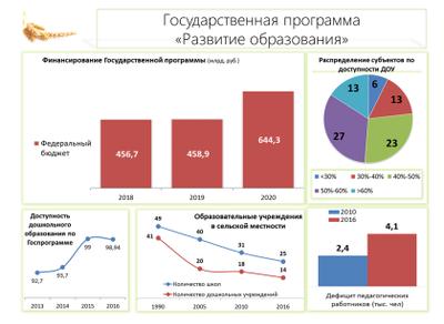 При этом можно с уверенностью говорить о том, что рассматриваемая государственная программа ситуацию в образовании на сельских территориях никак не поправила. Более того, к 2016 году на селе осталось всего 25 тыс. общеобразовательных учреждений и 14 тыс. детских садов. А это соответственно в 2 и 3 раза меньше, чем было в 1990 году.