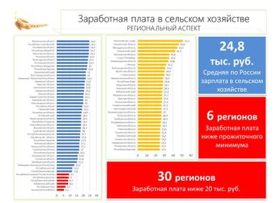 Средняя зарплата в сельском хозяйстве является одной из самых низких – 24,8 тыс. руб., или 65% от средней по экономике. При этом в 30 регионах средняя зарплата в сельском хозяйстве ниже 20 тыс. рублей, а в 6 из них и вовсе ниже прожиточного минимума.